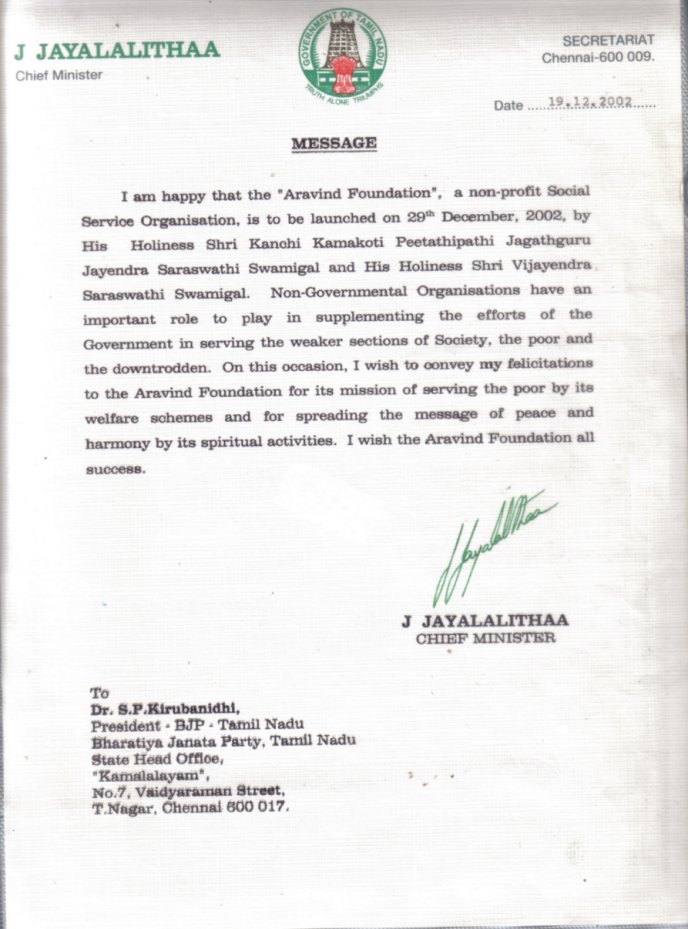 “Government Schemes & Non-Governmental Organizations” - A book let published in the vernacular language - 29/12/2002 at the formal launch of Aravind Foundation. It was released by Jagat Guru Jayendra Saraswati Swamigal of Shri Kanchi Mutt. It carried the felicitation message from the Hon`ble Chief Minister of Tamilnadu, Selvi. J Jayalalitha.